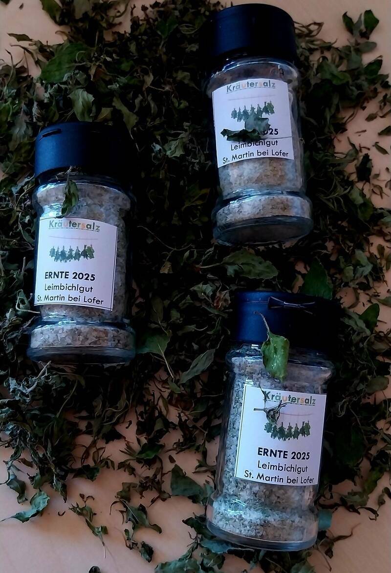 Die frisch geernteten Kräuter werden fein gehackt und sofort mit hochwertigem Salz vermengt. So bleiben Farbe, Duft und Aroma wunderbar intensiv erhalten. Das Salz zieht die wertvollen Pflanzenstoffe sanft ein – ganz ohne künstliche Zusätze, ganz ohne Schnickschnack. Nur Kräuter, Salz und bäuerliche Handarbeit.